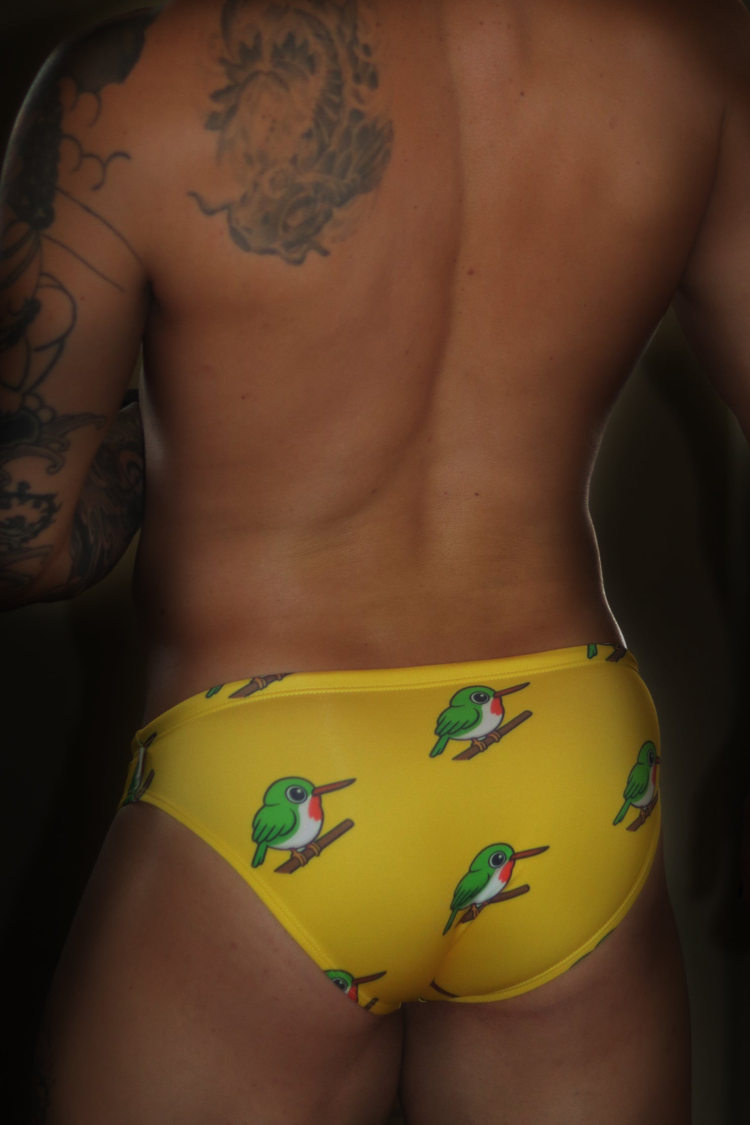 This men’s swim brief features a bright, playful print of El San Pedrito, Puerto Rico’s beloved and endangered tody. Its vibrant yellow design pairs perfectly with the cute cartoon artwork, making it fun, tropical, and full of island charm. Made from high-quality recycled fabric, this brief celebrates one of Puerto Rico’s most iconic species.